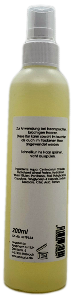 Sprühkur mit Honig zur schnellen Regeneration der Haaroberfläche. Glättet das Haar und macht es leicht frisierbar, für jeden Haartyp geeignet. Auch bei dichtem Haar sehr gut anwendbar.
