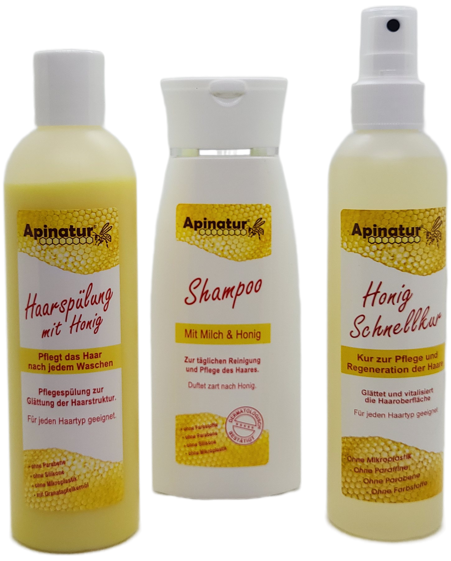 Set besteht aus: 1x Haarspülung mit Honig, 1x Shampoo mit Duft, 1x Honig Schnellkur